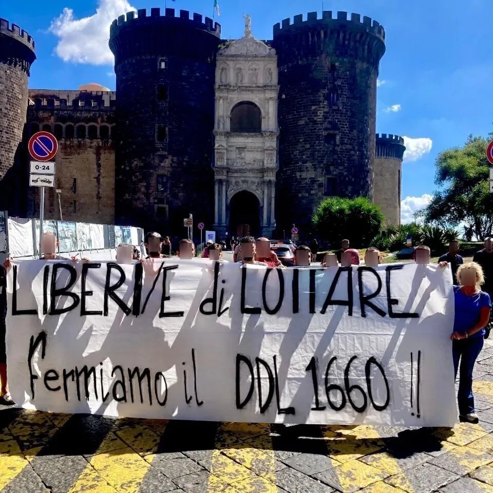 A Napoli, il Movimento di lotta per il lavoro 7 novembre ha già portato in piazza, ieri, la parola d’ordine e il nome della Rete davanti ad una serie di luoghi simbolo del potere politico di ieri e di oggi (nella foto, davanti al Maschio Angioino) – la loro iniziativa è stata commentata così dal Laboratorio politico Iskra: “Questa mattina, mentre in Parlamento iniziava la discussione sui decreti sicurezza, a Napoli iniziava la campagna “Liberi di lottare: fermiamo il DDL 1660″. Assemblee nazionali svolte con decine e decine di organizzazioni e comitati hanno dato il via ad un largo movimento che dovrà opporsi ad un disegno di legge che vuole garantire la pace sociale necessaria al governo della guerra reprimendo sempre più le lotte sociali, creando al contempo nuove sacche di marginalità. A partire da oggi daremo indicazioni per la crescita di una campagna sempre più necessaria di fronte allo scenario in atto, aggiornando costantemente le nostre pagine con le nuove iniziative e gli appuntamenti calendarizzati. Siamo la parte giusta della storia. Contro la guerra e contro chi criminalizza chi la contrasta, questo autunno fermiamo il DDL 1660!”.