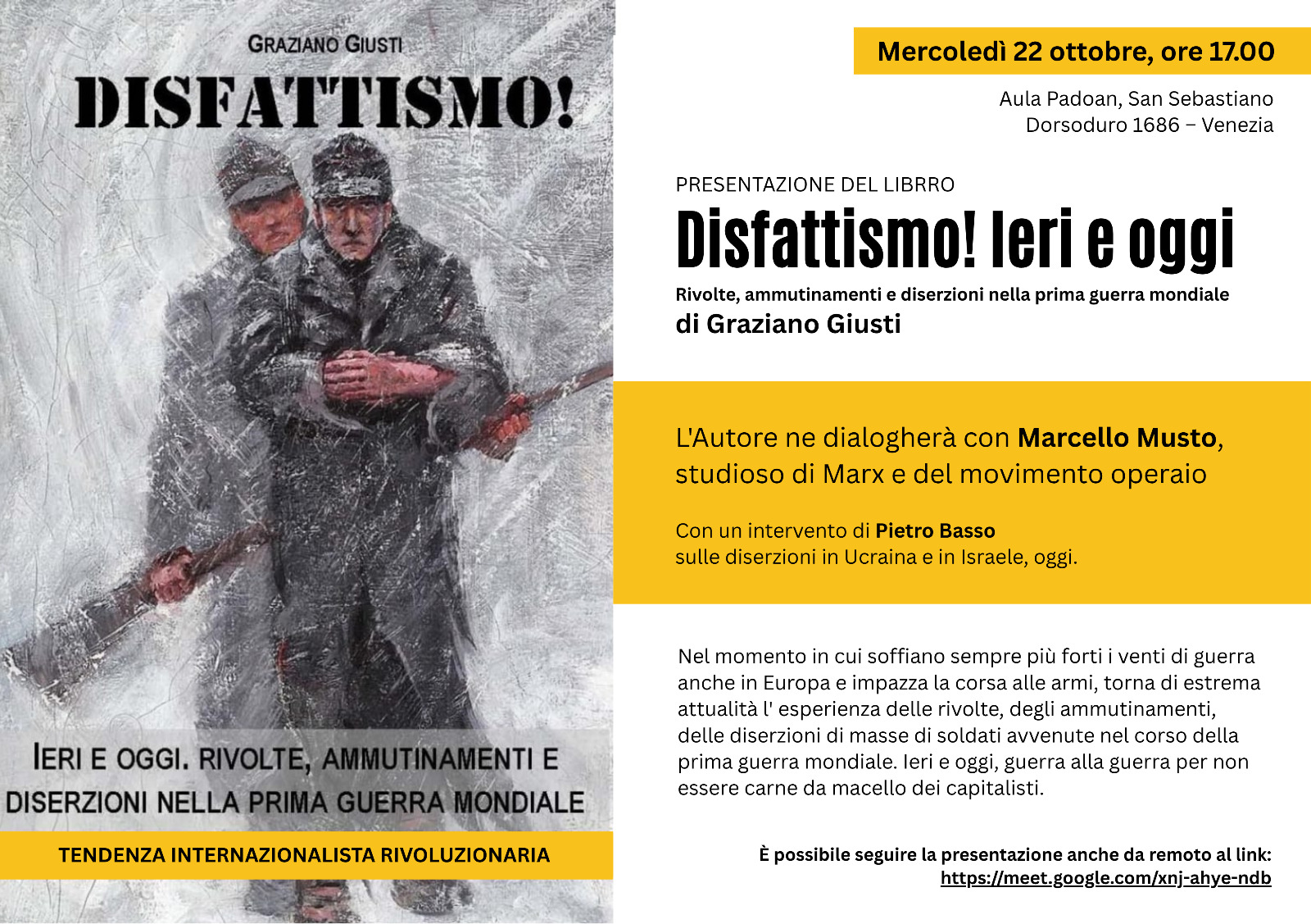 Di questo si occupa il libro Disfattismo! di Graziano Giusti, edito da Pagine marxiste, che sarà presentato mercoledì prossimo a Venezia dall’Autore e da Marcello Musto, noto studioso di Marx e della storia del movimento operaio. Ci sarà anche un intervento di Pietro Basso sulle diserzioni in Ucraina e in Israele, oggi.