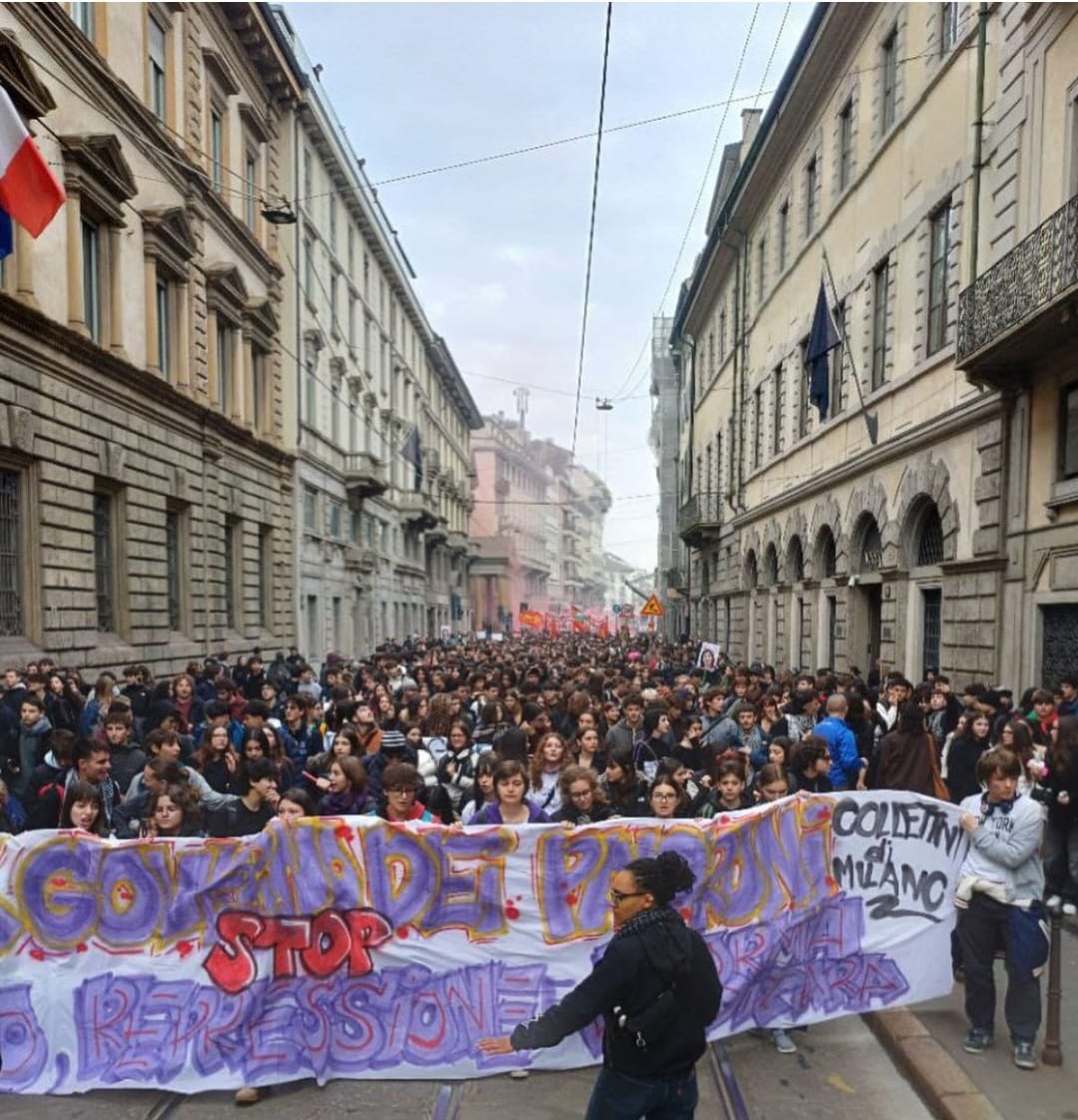 «Si sono infatti moltiplicate le segnalazioni di PCTO svolti in collaborazione con reparti dell’esercito e con aziende come Leonardo, percorsi il cui obiettivo di reclutamento di manodopera per la macchina bellica è sempre più evidente. Dopo il fallimento evidente del nuovo indirizzo “Liceo del Made in Italy”, ennesimo tentativo di trascinare la scuola e l3 studenti nell’autocelebrazione nazionalista da parte del Governo Meloni, il Ministero del Merito ha provato a ripiegare propagandando il relativo successo del modello ITS Academy, sostenendo che tali percorsi permetterebbero all’87% dei diplomati di trovare lavoro entro un anno. Questi dati, raccolti nel corso del primo anno di sperimentazione del nuovo modello, non restituiscono una reale efficacia di quest’ultimo, considerando anche che l’aumento generale dell’occupazione non influisce minimamente sul carovita, sull’inflazione, sull’erosione del potere d’acquisto e su tutte le dinamiche della crisi economica che rendono la vita impossibile a migliaia di giovani e studenti. Inoltre, mentre i costi proibitivi del materiale scolastico mettono a dura prova studenti e famiglie, il Ministro Valditara ha ben pensato di stanziare 500 milioni in favore delle scuole paritarie, smantellando sempre di più la concezione di una scuola pubblica e solidale. L’attuale sistema scolastico rappresenta ormai un modello di istruzione che, pur professandosi “apolitico”, è legato a doppio filo alle dinamiche capitalistiche, economiche e aziendali che fanno dei saperi un’operazione di marketing, dell’obbedienza al potere un obbligo e della guerra il fine ultimo di ogni ricerca. Noi studenti non intendiamo più accettare lo sfruttamento fisico e psicologico a cui ci sottopone il sistema scolastico, non permetteremo che i nostri corpi e le nostre menti vengano utilizzati come strumenti dell’imperialismo, non ci piegheremo di fronte alla repressione della nostra voce di dissenso e delle nostre proposte politiche di alternativa al sistema di istruzione neoliberista».