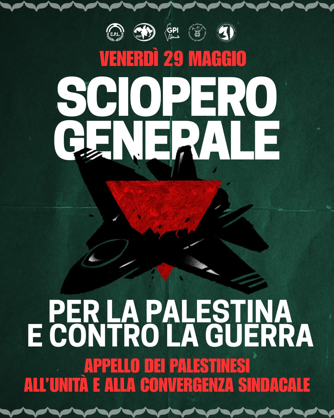 Riceviamo e volentieri pubblichiamo questo invito all’unità del sindacalismo combattivo da parte delle organizzazioni palestinesi in vista dello sciopero generale “per la Palestina e contro la guerra” del 29 maggio, il cui senso di fondo condividiamo – laddove non condividiamo il silenzio dell’appello per il 29 sull’aggressione USA-Israele (e complici arabi ed europei, in primis l’Italia degli ipocriti Meloni-Mattarella) all’Iran. (Red.)