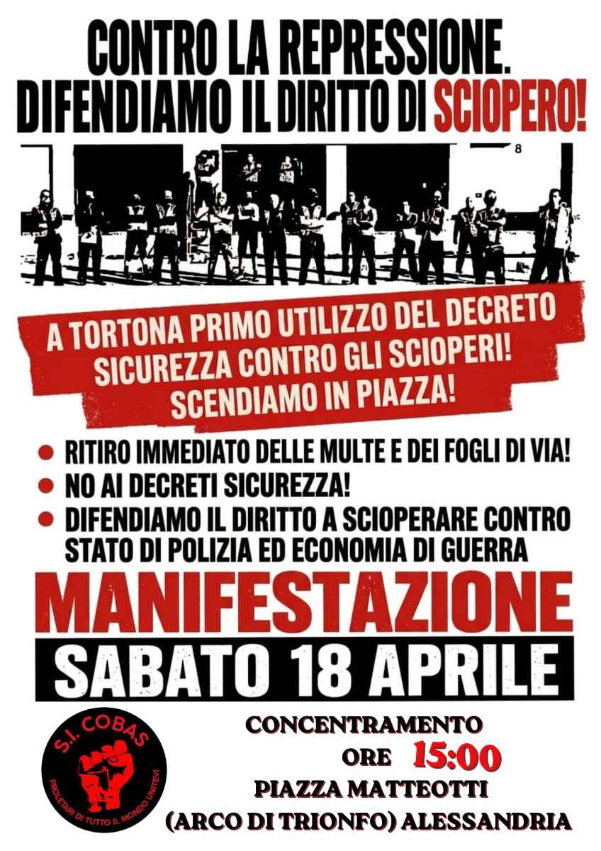 IL DECRETO SICUREZZA SVELA IL SUO VERO FINE: LA PRIMA APPLICAZIONE IN ITALIA È CONTRO UNO SCIOPERO DI LAVORATORI. RISPONDIAMO UNITI: SABATO 18 APRILE MANIFESTAZIONE AD ALESSANDRIA! Multe fino a 10 mila euro, fogli di via, aperture indagini: la questura di Alessandria reprime lavoratori e sindacalisti rivelando il vero scopo di queste leggi. Tutto questo […]