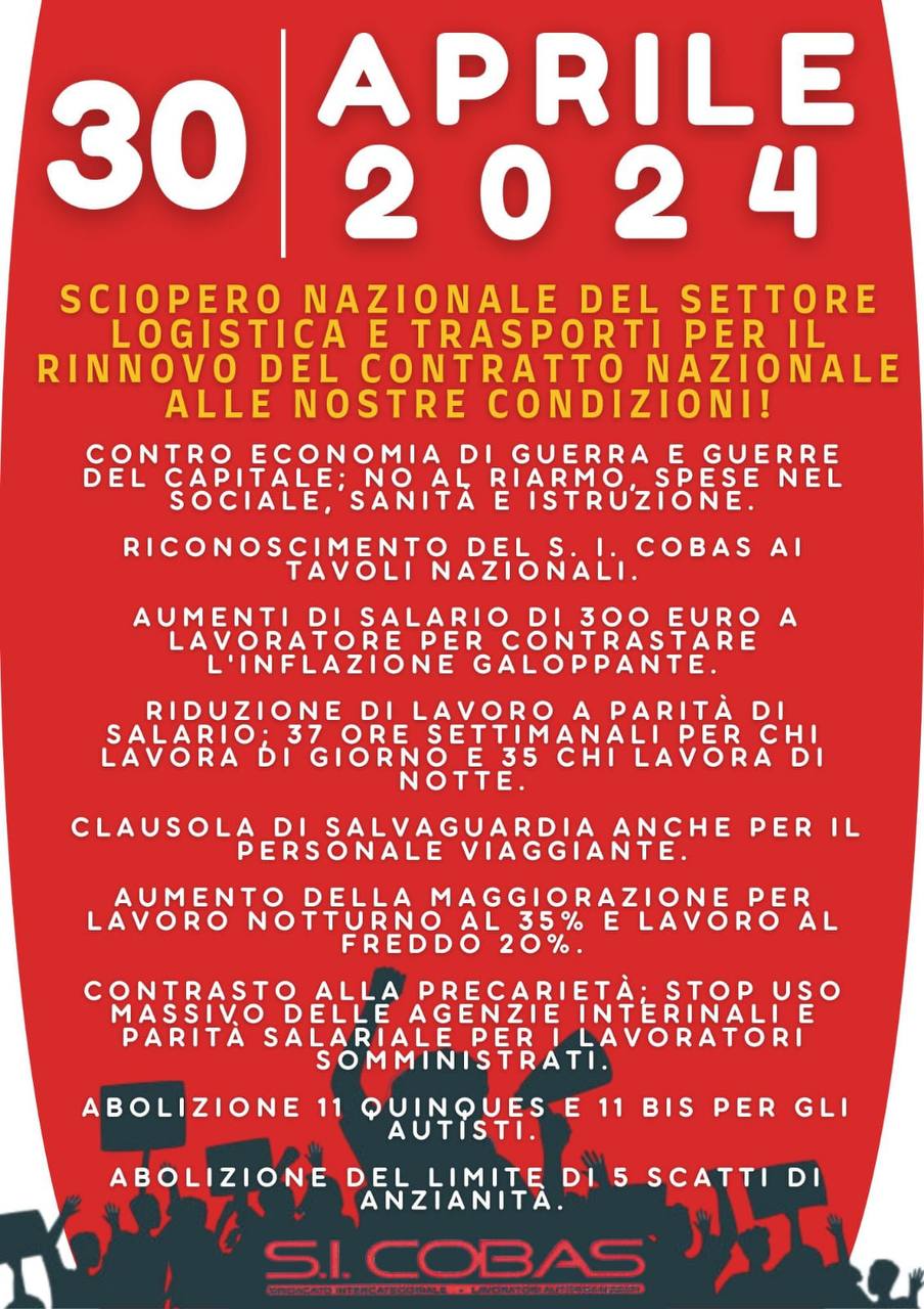 Lo sciopero è indetto anche da Adl-Cobas, SGB, CUB e Confederazione Cobas lavoro privato.